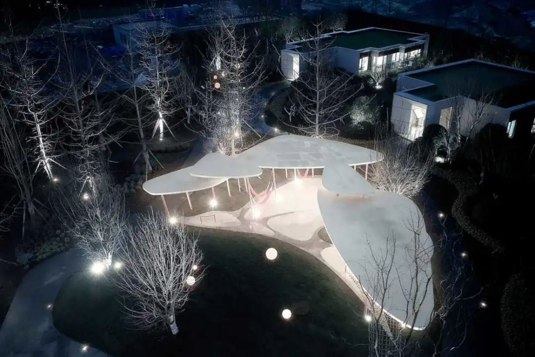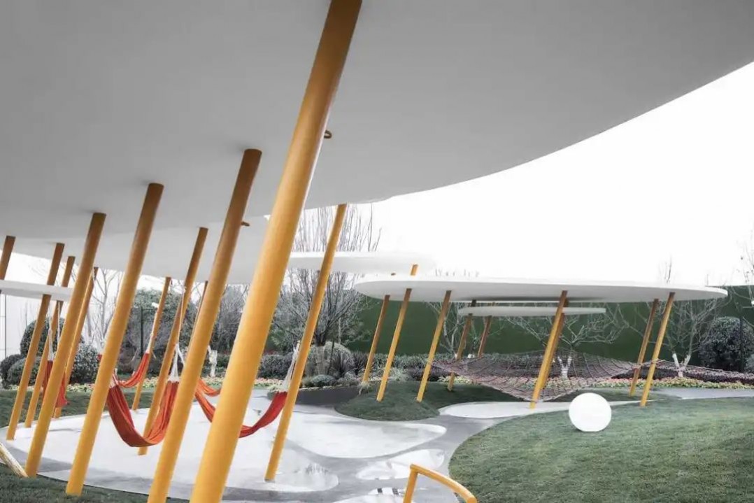 ▼白色輕盈的廊架,錯落的藝術(shù)造型,如同美麗的冰屋