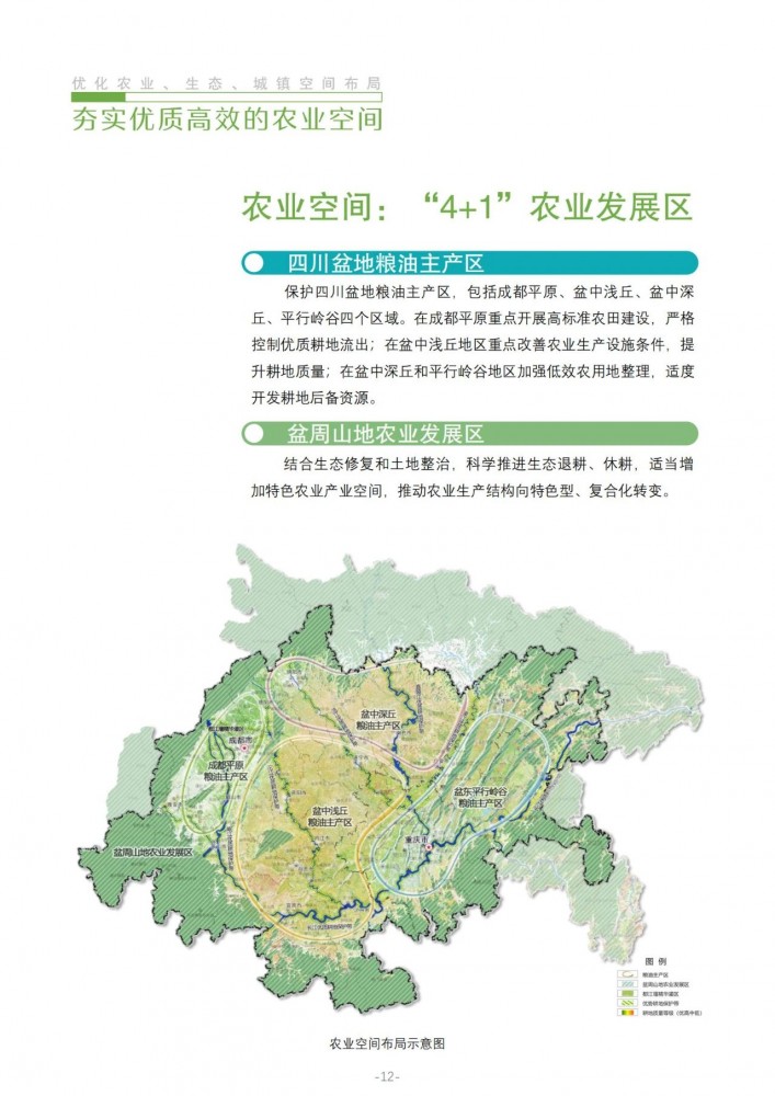 規(guī)劃在優(yōu)化農(nóng)業(yè)空間布局上,提出構建“4+1”農(nóng)業(yè)發(fā)展空間。其中,“4”指的是構成四川盆地糧油主產(chǎn)區(qū)的成都平原、盆中淺丘、盆中深丘、平行嶺谷四個區(qū)域?!?”指的是四川盆地周邊山地農(nóng)業(yè)發(fā)展區(qū)。